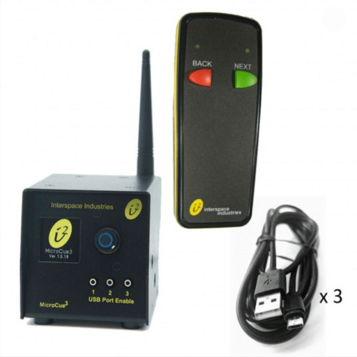 The MicroCue3 brings ease of use, reliability and control to the world of the small to medium presentation.  A single MicroCue3, offers three USB ports to control three computers, using separate front panel buttons that also show the status of that connection. An LCD screen shows the cues of the taught handsets, the signal strength, and just as important, the battery condition of the handset itself.