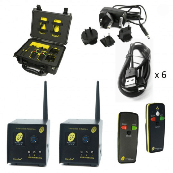 The MicroCue3 brings ease of use, reliability and control to the world of the small to medium presentation.  A single MicroCue3, offers three USB ports to control three computers, using separate front panel buttons that also show the status of that connection. An LCD screen shows the cues of the taught handsets, the signal strength, and just as important, the battery condition of the handset itself.