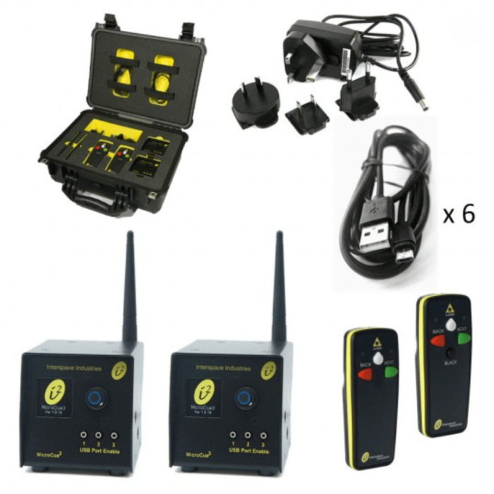 The MicroCue3 brings ease of use, reliability and control to the world of the small to medium presentation.  A single MicroCue3, offers three USB ports to control three computers, using separate front panel buttons that also show the status of that connection. An LCD screen shows the cues of the taught handsets, the signal strength, and just as important, the battery condition of the handset itself.