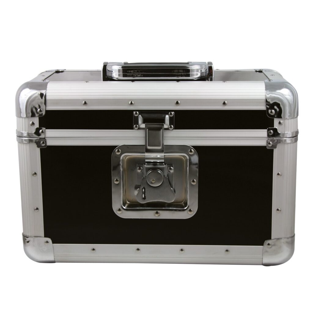 - The case is fitted with foam and has a butterfly lock. A handle is on top of the case.