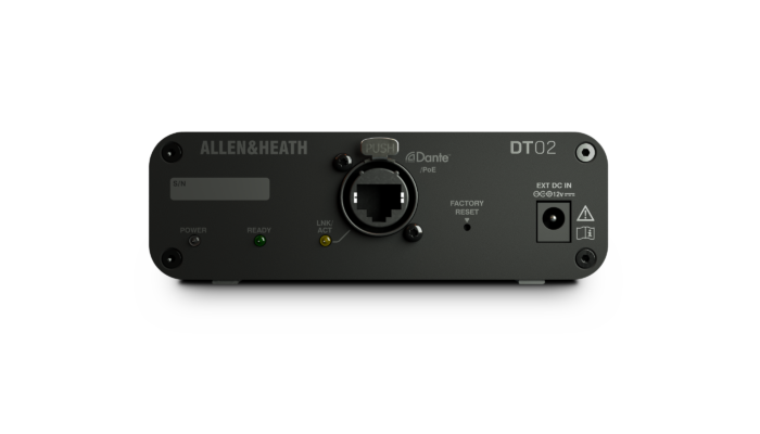DT02 is a cost-effective, compact 48kHz/96kHz Dante interface enabling 2x XLR outputs wherever you need them on your Dante network. Ideal for a wide variety of fixed installation and AV hire / portable applications, DT02 can be used with any Dante-equipped Allen & Heath mixer or AHM system, as well as with third party Dante systems.