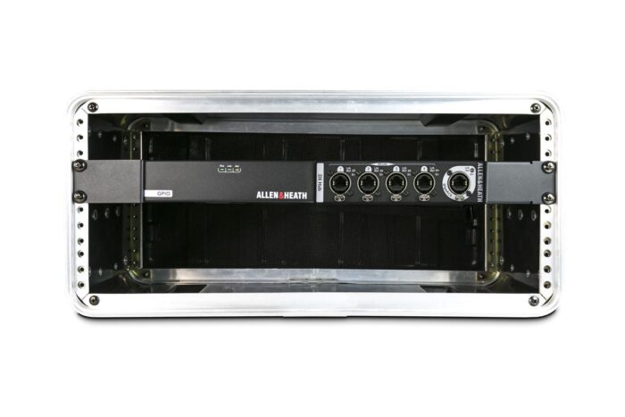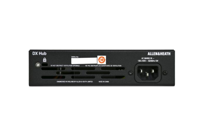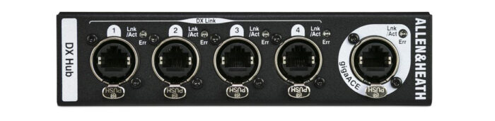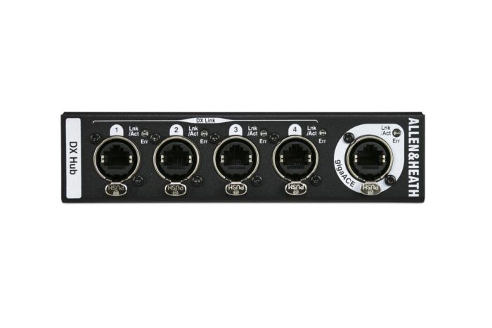 The DX Hub is a remote audio networking hub that can be connected to any Allen & Heath AHM-64, SQ or Avantis mixer via SLink, or any Avantis mixer or dLive system fitted with a gigaACE I/O module. It provides 4 DX Link ports each carrying 32×32 channels of 96kHz audio, that can be used to connect to DX expander units.