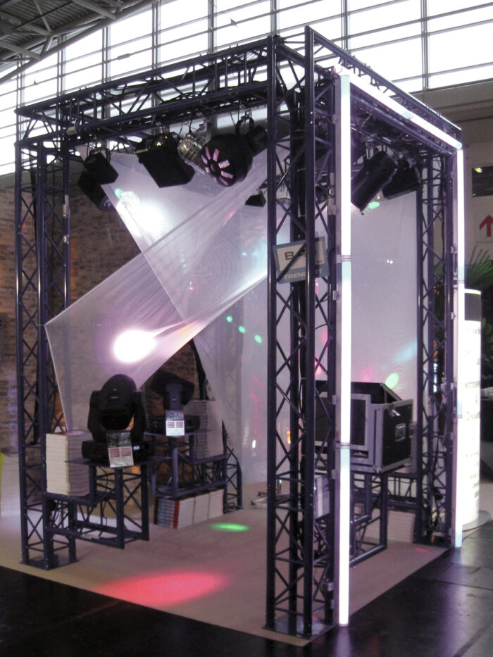 DECOLOCK DQ3 3-point truss systemDECOLOCK DQ3 is a 3-point truss system made of aluminum. The individual elements are connected via three cones, pivots and pins.The advantage of the conical connection system is that the cones completely fit into the main chords so that highest load capacity is guaranteed. The Quick-Lock system enables fast, efficient and highly aesthetic assembly when the truss constructions are frequently assembled and dismantled.The three main chords are made of 35 mm aluminum tube with 2 mm wall thickness and offer sufficient strength at a low weight. The braces have a diameter of 10 mm with 2 mm wall thickness and provide the system with a decorative appearance.With DECOLOCK, you can realize compact installations with low self weight, e. g. for shop displays, shop decorations, exhibitions, interior design, fair booths, discotheques and theatres.DECOLOCK is primarily designed for decorative installations and can be used for permanent or temporary installations due to its highly aestethic appearance. The advantages of this system are the compact construction with 220 and 195 mm outer dimensions, low weight, optimum strength along with easy and quick assembly.The documentation of this truss system is closely related to the Codes of Practice SQ P1 – Truss Systems published by the VPLT/PLASA. The load table as calculation base can be downloaded from the Internet before buying the product!Please note: this truss system must never be combined with other systems!