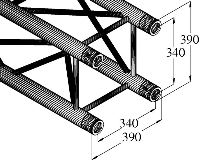 QUADLOCK TQ390 4-point truss systemQUADLOCK TQ390 is a 4-point truss system made of aluminum. The individual elements are connected via four cones, pivots and pins.The advantage of the conical connection system is that the cones completely fit into the main chords so that highest load capacity is guaranteed. The Quick-Lock system enables fast, efficient and highly aesthetic assembly when the truss constructions are frequently assembled and dismantled.The four main chords are made of 50 mm aluminum tube with 2 mm wall thickness and offer a good relation between strength and weight. The braces have a diameter of 20 mm with 2 mm wall thickness and provide higher strength and load capacity.With 390 mm outer dimensions, QUADLOCK TQ390 is a stable truss system for higher loads and extended durability. This system is mainly designed for intense use in stage installations, fair installations, event installations but also for permanent installations in discotheques and theatres.Due to its higher outer dimensions and the enforced braces, larger structures for tour stages, large discotheques etc. can be realized.The production of this truss system is TUV-monitored. The load table as calculation base can be downloaded from the Internet before buying the product!Please note: this truss system must never be combined with other systems!