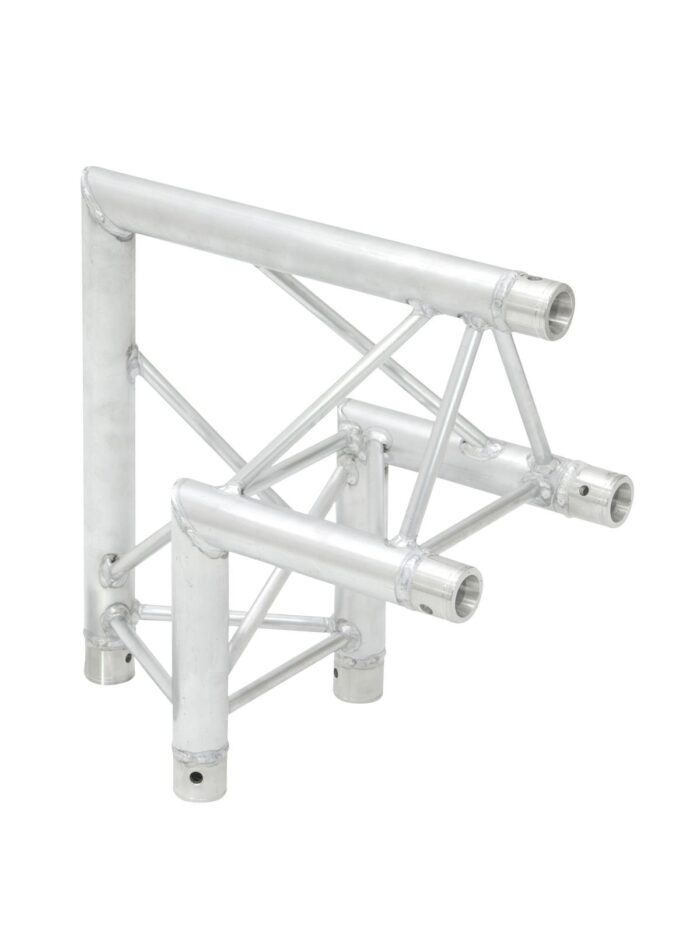 TRILOCK 6082 3-point truss system TRILOCK 6082 is a 3-point truss system made of aluminum. The individual elements are connected via three cones, pivots and pins. TRILOCK 6082 is made of EN-AW 6082 T6 (AlMgSi1 T6) alloy for even higher loads. The advantage of the conical connection system is that the cones completely fit into the main chords so that highest load capacity is guaranteed. The Quick-Lock system enables fast, efficient and highly aesthetic assembly when the truss constructions are frequently assembled and dismantled. The three main chords are made of 50 mm aluminum tube with 2 mm wall thickness and offer a good relation between strength and weight. The braces have a diameter of 16 mm with 2 mm wall thickness and leave enough space for installing couplers, hooks and clamps. With 290 and 257 mm outer dimensions, TRILOCK QTTR is a stable truss system for higher loads and extended durability. This system is mainly designed for intense use in stage installations, fair installations, event installations but also for permanent installations in discotheques and theatres. Its polished surface makes this universal system a real eye-catcher. Due to its wide range of standard system lengths, corners, circles and accessory, this system is highly versatile and offers unlimited design possibilities. The production of this truss system is TUV-monitored. The load table as calculation base can be downloaded from the Internet before buying the product! Please note: this truss system must never be combined with other systems!