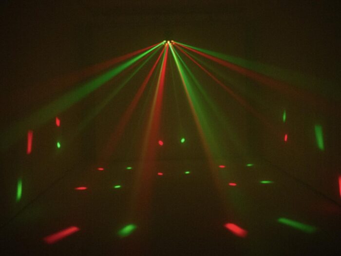 - Beams exit from every lens, perform circular movements and change the direction of movement with every bass-beat