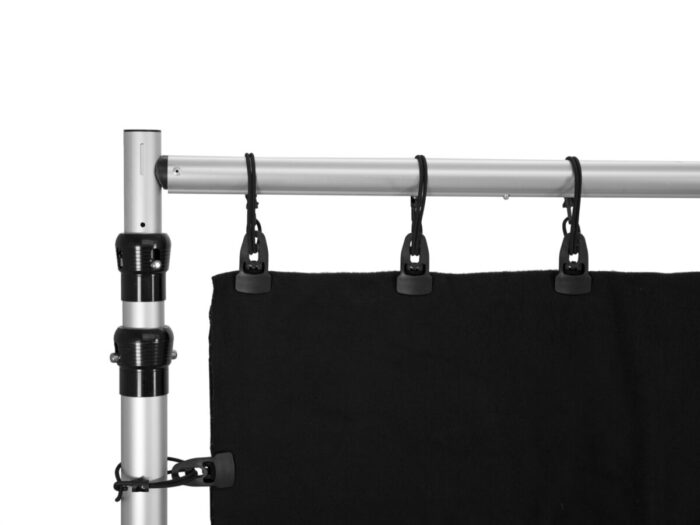 - The vertical bars are simply put onto the base plates. Then lock in the telescopic crossbar and attach hush cloth to it with tethers and the stage background is set up.