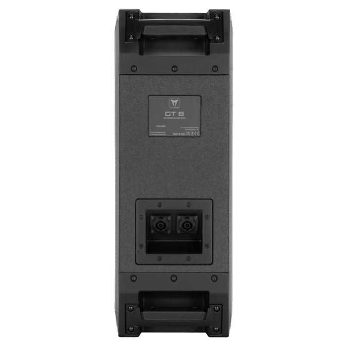 GT 8 is built to endure the rigors of touring, featuring a robust plywood cabinet coated with a durable polyurea finish that provides exceptional waterproofing and scratch resistance. Ergonomic die-cast aluminum handles with rubber grips on the top and bottom ensure comfortable and secure handling. A magnetically detachable grille enables quick access to the internal components, while the rotatable TRW waveguide—secured by a high-force magnetic assembly—can be adjusted without tools. A side inspection window allows easy verification of the selected coverage pattern. Quick-Fit M10 sockets on the top and bottom provide integration with various accessories, including horizontal and vertical brackets, subwoofer stack mounts, and pole mount adapters. The connection panel features two SpeakON STXX Series 4-pole IP54 heavy-duty metal connectors.