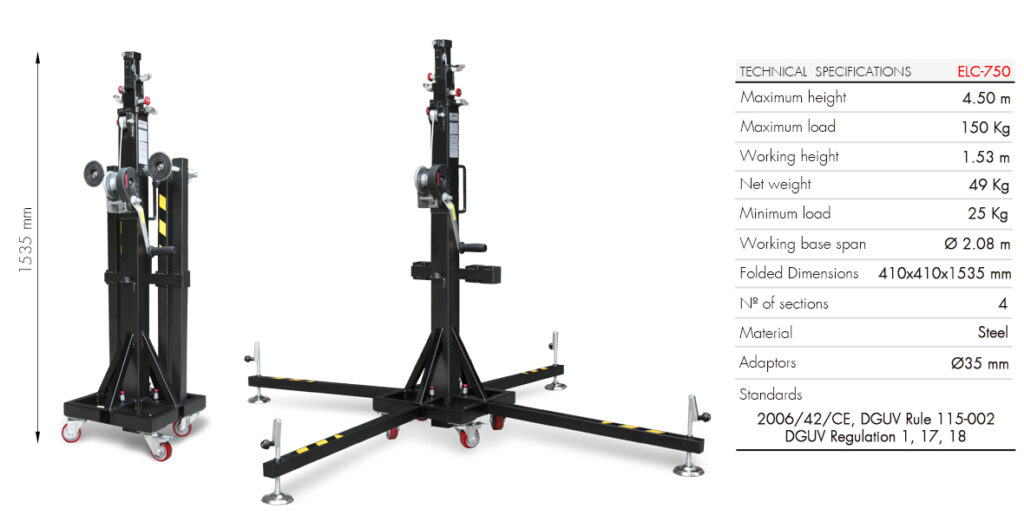 TELESCOPIC LIFTING TOWER. MAXIMUM HEIGHT: 4.50 m / MAXIMUM LOAD: 150 kg / FOLDED HEIGHT: 1.48 m