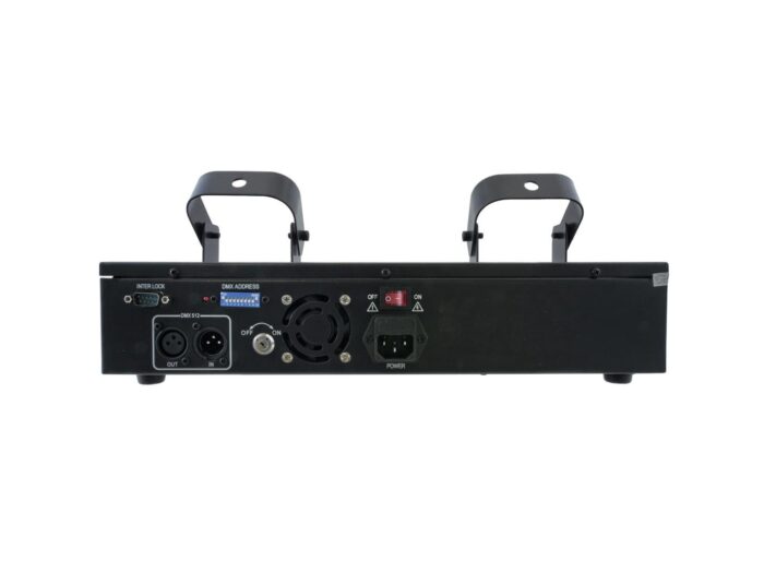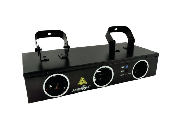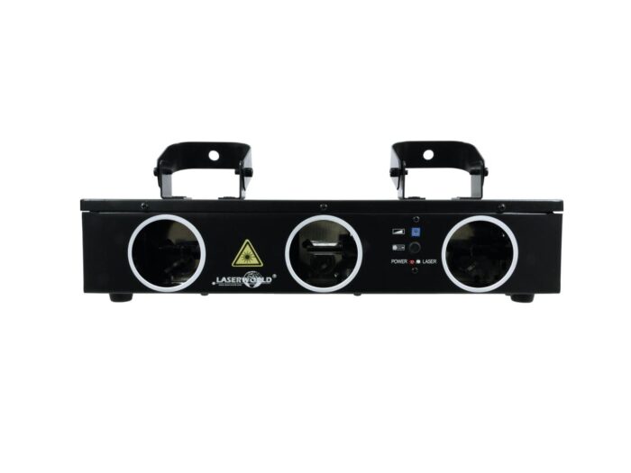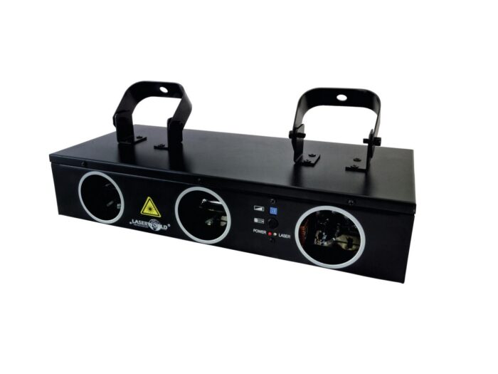 The Laserworld EL-200RGB is a RGB laser system with a total output power of up to 200 mW. The red diode laser module with a wavelength of 650 nm, the green DPSS laser module with a wavelength of 532 nm and the royal-blue laser module with a wavelenght of 445 nm ensure beautiful colors and brightness. The beams have a diameter of about 3 mm and a beam divergence of about 2 mrad and the projector offers high-speed stepper motors with 2-5 kpps as well as a scan angle of up to 30°. About 50 preset basic patterns, like layers, tunnels, fences, waves etc. can be controlled via DMX. A sound-to-light mode as well as a stand-alone mode are available, too. For the sound-to-light mode the sensitivity of the integrated adjustable microphone can be adjusted. There is an on-off switch at the rear side of this device. The triple laser aperture provides extra intense red, green and blue beam effects. The Laserworld EL-200RGB is a good solution for first-time users and mobile use and it is often used in bars, small clubs, at private parties or for home use. With ultra bright 445 nm royal blue!