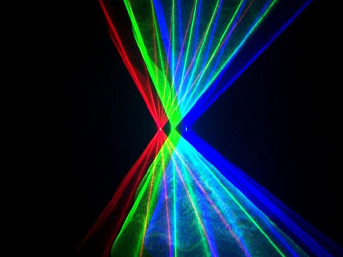 Show laser class 3 with 200 mW power and three lenses in red, green, blue