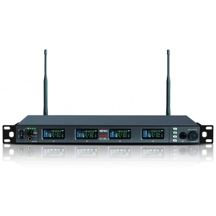 SQM Rental House presents the Mipro ACT-848 professional digital receiver. Equipped with two antennas, the four-channel receiver works in the UHF 5F band (540-604MHz), and the frequency response is in the range of 20 to 20,000 hertz (-2dB). Other features that make the 24-bit receiver stand out are low latency (2.7ms), a sampling rate of 44.1kHz, or total harmonic distortion of 0.03% (1kHz).