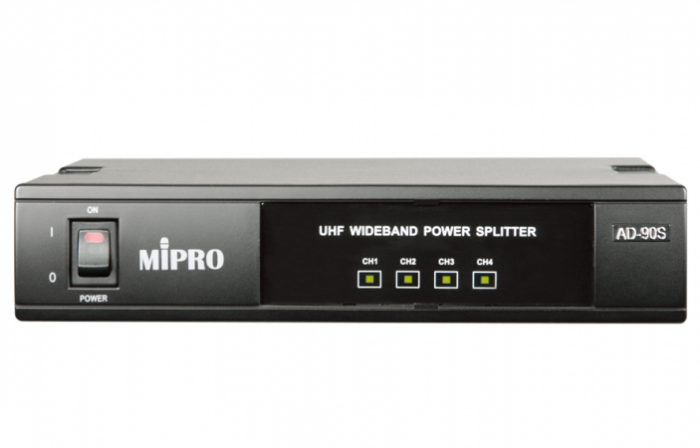 Firstly introduced into the market in 2006, the AD-90S was designed to provide MIPRO’s MI-909T stereo in-ear monitoring transmitter, MT-92A wireless interlinking transmitter or MTS-100 digital stationary transmitter to divide its output power into 4 transmitting antennas without power loss. Each channel has a maximum output level of +26 dBm (0.4 W).
