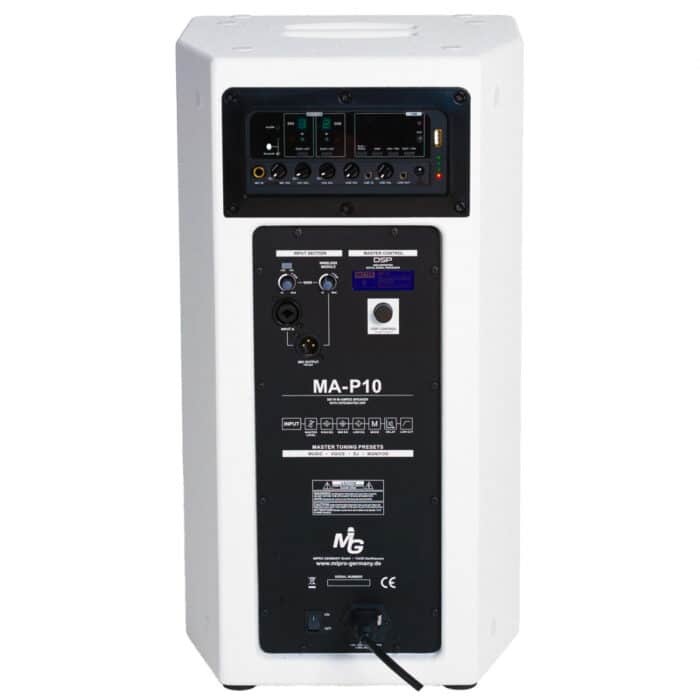 The all-new MA-P10 powered 10″ / 2-way loudspeaker is an uncompromising, self-powered, fullrange speaker as an ideal allround solution. The inbuilt wireless module with a 2 channel UHF reciever and an included MP3-payer makes it very flexible in use and easy in setup. Whether on stage or installed, the ultra lightweighted MA-P10 convinces with a full package of features, delivering spectacular and precise sonic performance. The MA-P10 is the most flexible solution for presenters, musicians, DJs, mobile entertainers and rental companies. The newest generation of DSP technology handles all the processing and allows full control of power, limiters, amplitude and phase equalization. In addition it offers a digital signal delay line with adjustable delays between 0 an 100 meters. The MA-P10 is based on tour-grade wood enclosures, highsensivity transducers and latest bi-amped 1.000 W power modules (class-D). > Extensive DSP featuring groundbreaking DTA2© technology The DTA2© digital time alignment algorythms provide for 100% matching, time-corrected and synchronized signals. DTA2© combines the woofer with the high frequency driver to an acoustically detected single-point source across the entire listening area. > IDSE© intelligent digital sound editor (on-board optimization) The powerful IDSE© intelligent digital sound editor enables effective on-board optimization. The editor includes a 3-band equalizer (±12dB), global master tuning presets, the adjustable low-cut filter at 80Hz, 100Hz, 120Hz and 150Hz (for operation with a self-powered subwoofer) and a digital delay line adjustable from 0 to 100 meters. > DBL© dual-band limiters for independently stable performance DBL© dual-band limiters ensure a stable performance at any level. > Single-encoder EASY CONTROL DSP interface > Global master tuning presets and adjustable low-cut filter > Combo input (XLR/6.3 jack with MIC/LINE switches) > Rotatable high-frequency horn > Rugged, texture-painted plywood enclosure > Sophisticated high-sensivity transducers > Extra-wide 90° beam angle (for advanced sound distribution)