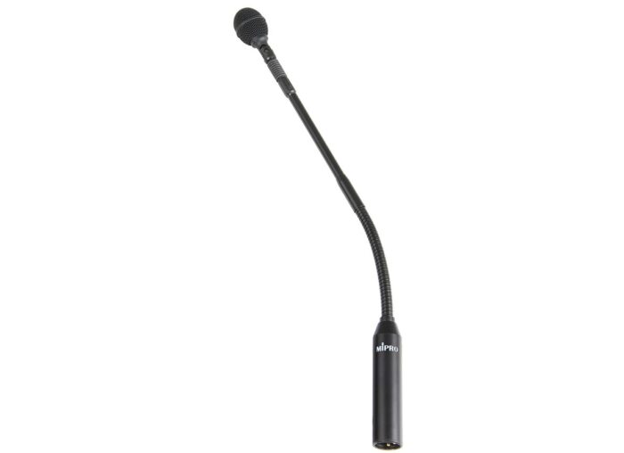 The MIPRO MM-204 is a 15.1″ 10 mm unidirectional condenser gooseneck microphone with an ultra-slim profile, designed for podiums, pulpit and lectern applications. It features a mount design that allows 110º up/down and 300º left/right angle adjustments. Shock isolation minimizes handling and vibration noise, while the multi-layered grill minimizes pop noise.