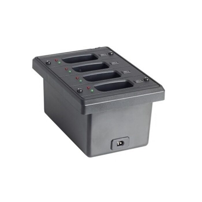 4-slot convenient charging for up to 4 portable receivers or transmitters. Quick charge in less than 4 hours. Each charging slot has separate red charging and green ready indicator. Battery charging via DC output, 8V/0.75A power supply.