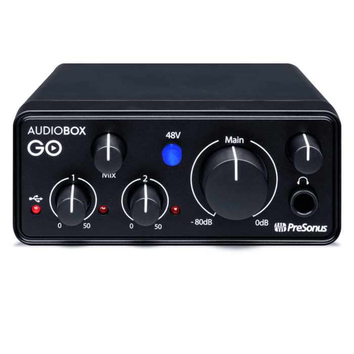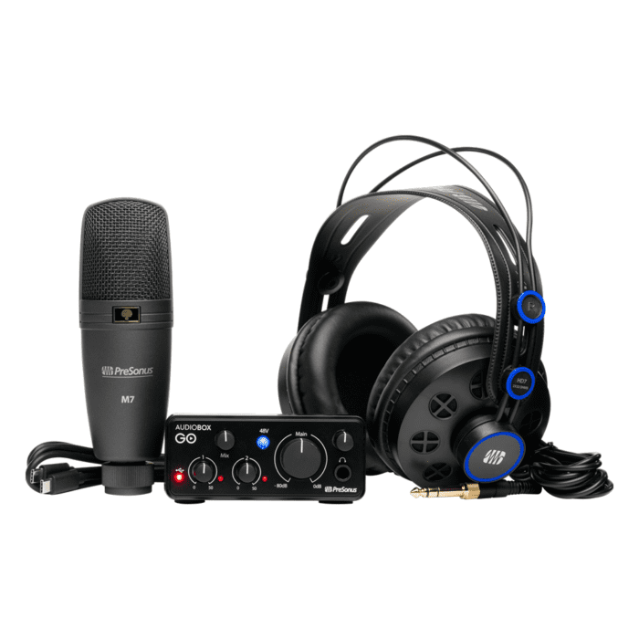 The PreSonus AudioBox GO Creator Bundle is your ultra-affordable one stop shop for creating studio-quality recordings. Featuring the ultra-compact and surprisingly powerful 2×2/24 bit / 96 kHz AudioBox GO USB Audio interface, pro recording software access with 6 months of Studio One+, a pair of ergonomic high-definition HD7 headphones, and a versatile M7 cardioid condenser microphone with mic stand adapter and windscreen, the PreSonus AudioBox GO Creator Bundle gives you everything you need to create like a pro, so you can get started recording right away.