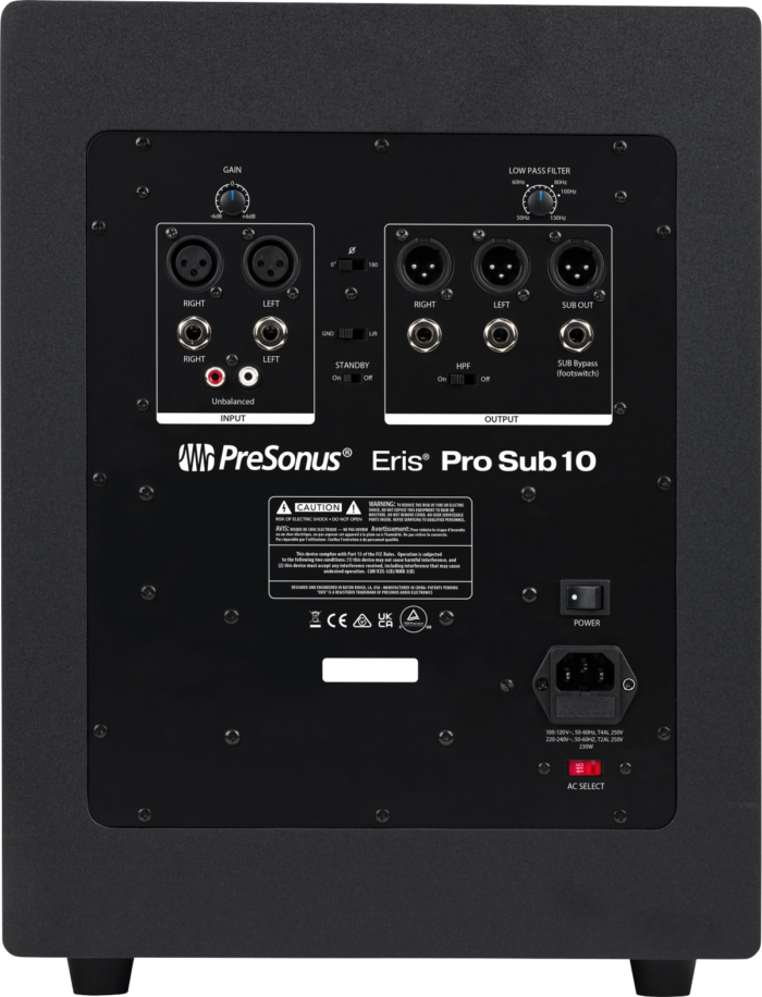 Powerful and musical, the PreSonus® Eris Pro Sub 10 active, front-firing studio subwoofer is designed to deliver fast and accurate transient response, extending low frequencies down to 20 Hz, allowing you to hear the full-spectrum range of your mix. Driven by 170W (RMS) Class AB amplification, the Eris Pro Sub 10’s 10-inch, glass-composite, low-frequency driver delivers tight, responsive sub-bass, thanks to its lightweight and rigid cone.