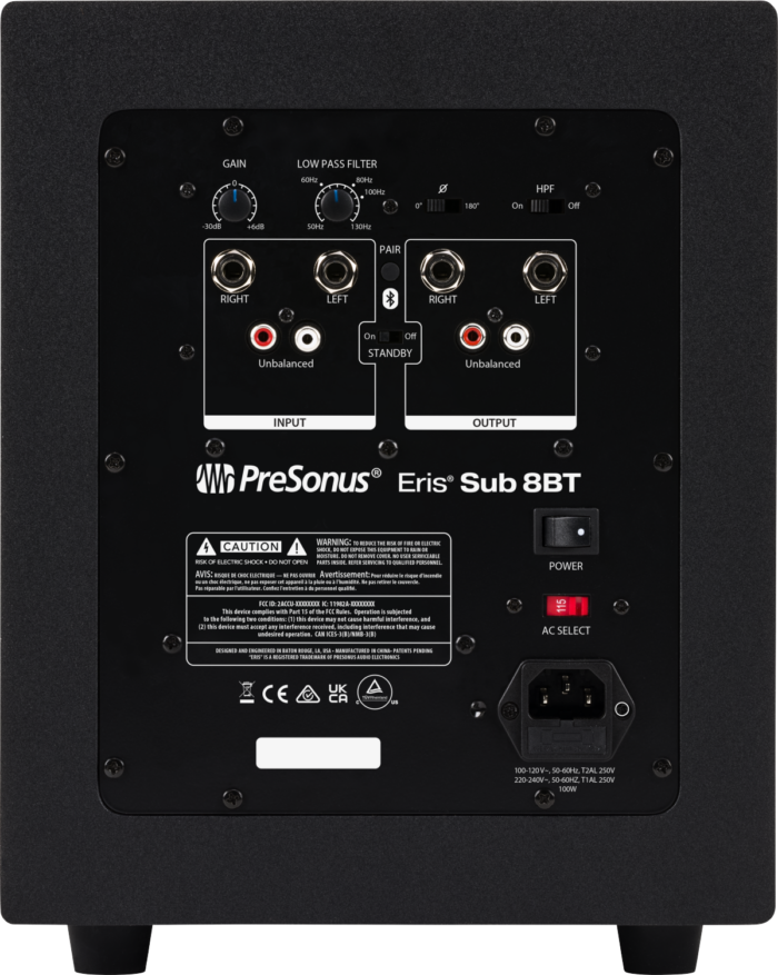 The first PreSonus® studio subwoofer to offer Bluetooth® 5.0 wireless connectivity, the Eris Sub 8BT provides flexible wired connection options, as well, making it easy to add a subwoofer to just about any monitoring setup. Onboard controls let you effortlessly create a 2.1 monitoring system and tune it to your room. Highpass filter and lowpass filter (crossover) controls ensure the Eris Sub 8BT starts working at the precise frequency where your main monitors stop, seamlessly extending the low-end of your monitoring setup.