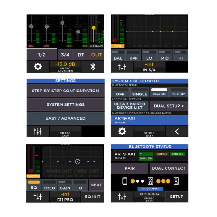 The ART912-AX back panel features a large 2.4-inch color touch screen and a push encoder to adjust all speaker settings on-the-fly. The dual-mode menu is optimized for fast navigation: Easy Mode for fast and immediate setup, Advanced Mode for professional tuning and signal routing.