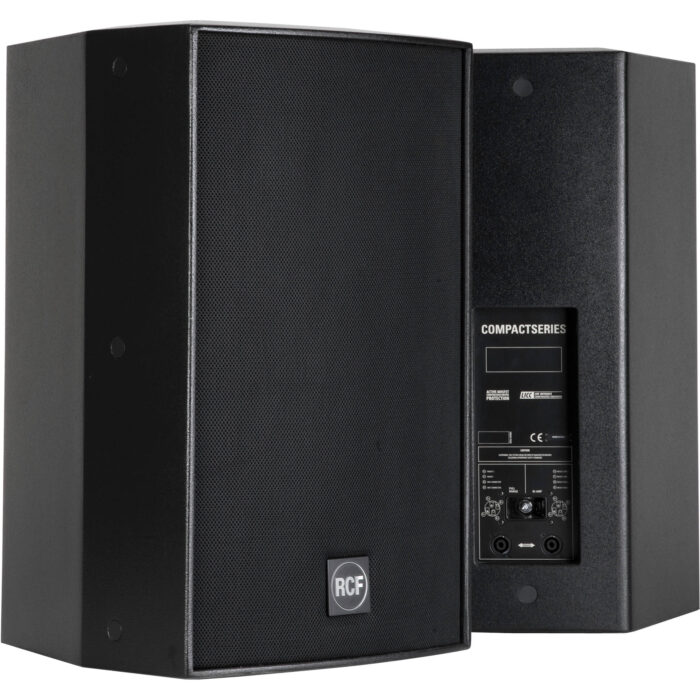 The cabinet is made of Baltic birch (heavy duty painted) and allows different installation options. It comes equipped with top and bottom multiplates for either wall or suspended mounting with chains. The installation points are available on its rear panel as well. The steel front grille is protected with a double layer polyurethane fabric and the front RCF logo is easily rotatable. Connections are made through 2 Neutrik SpeakON NL4 connectors (audio input and parallel link output).