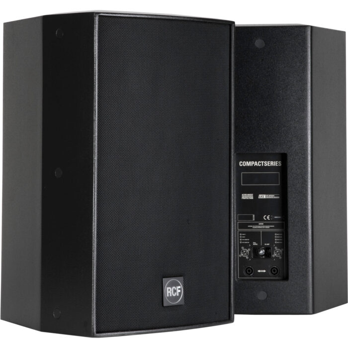 The internal crossover can be easily bypassed for bi-amplification. The cabinet is made of Baltic birch (heavy-duty painted) and allow different installation options, as it is equipped with top and bottom multiplates for either wall or suspended mounting with chains. Installation points are available on its rear panel as well. The steel front grille is protected with a double layer polyurethane fabric. The front RCF logo is easily rotatable. Connections are made through 2 Neutrik Speakon NL4 connectors (audio input and parallel link output).