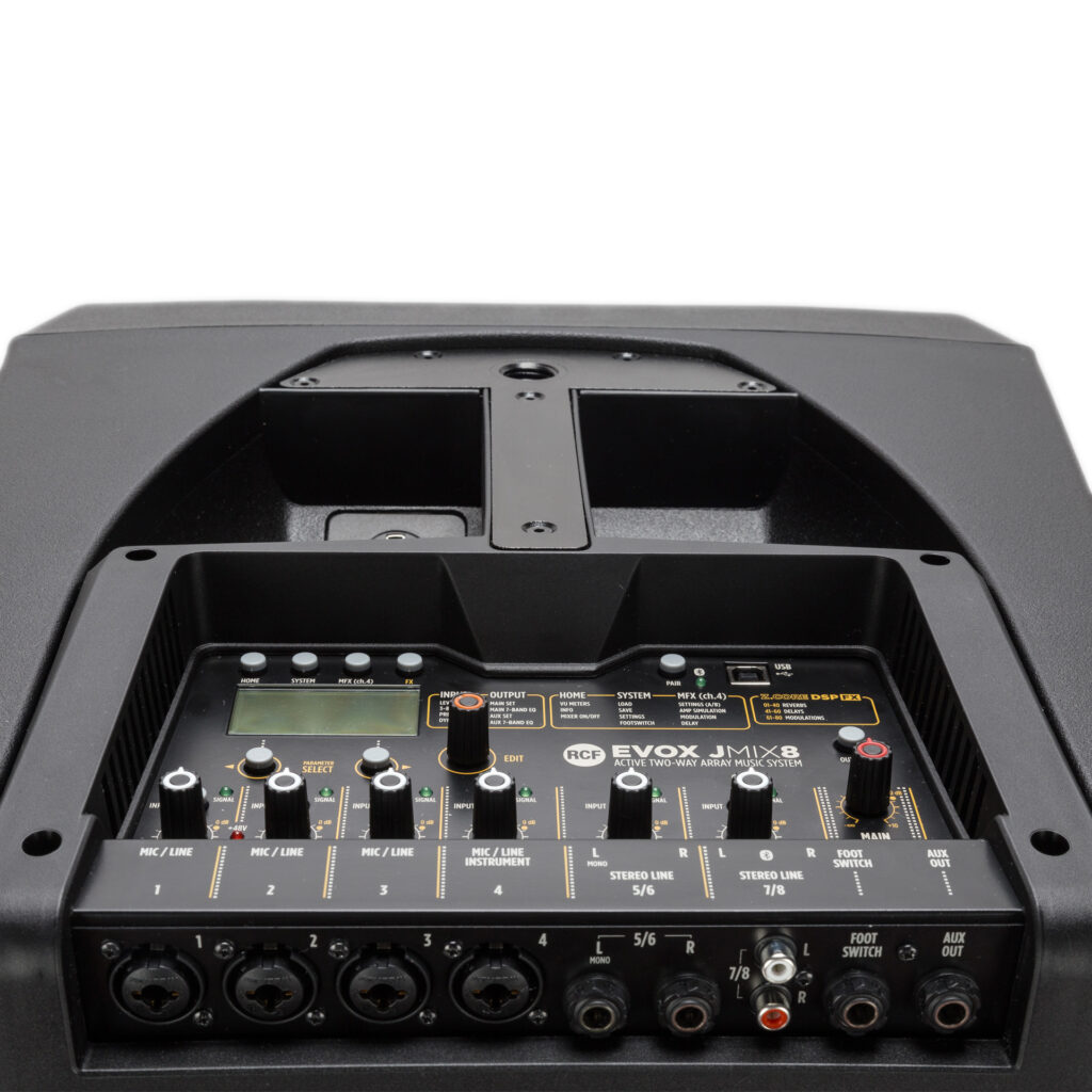 Taking the EVOX J Series one step further, RCF has added an 8-input Digital Mixer to the system. The onboard processing power of the innovative Z.CORE DSP provides not only full mix functions; it includes high-quality instrument FX and AMP simulations. An EVOX iOS/Android-compatible app allows to manage the JMIX8. Adding Bluetooth audio and Hi-Z instrument input,the EVOX JMIX8 combines the quality and reliability of RCF transducers and amplification with a powerful remote controllable 8-channel digital mixer._x000D_