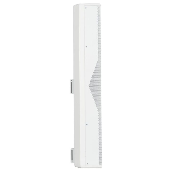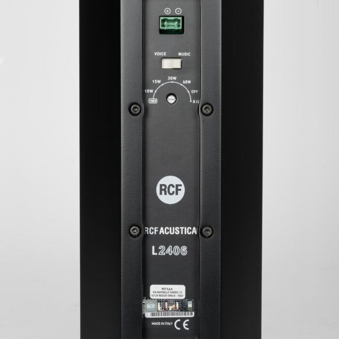 The L2406-T is a full range high intelligibility compact 3 way column speaker array with vertical controlled directivity for medium to large size installations. It is equipped with six 5″ woofers and four 1″ dome tweeters mounted in front of the two central woofers. This particular design permits coherent sound dispersion minimizing lobing in a very compact enclosure. The two central woofers are controlled differently from the other four because of the tweeters in front of them, in order to improve the directivity providing a true cardioid column operation.The wide coverage horizontal angle and the controlled vertical dispersion allow correct sound reproduction serving a wide area and assistance in limiting feedback and reverberated sound. A speech filter can be activated for enhancing the voice frequencies and improving speech intelligibility. The crossover is designed to avoid secondary lobing creation. Mounting accessories are provided and are designed to keep the column as close as possible to the wall and simplify the installation allowing suitable tilting. The L2406-T can be used connected to a low impedance amplifier to handle 200 W RMS power. It also includes a 60 W line transformer for 100 V systems. The crossover is equipped with a circuit to protect the four 1″ dome tweeters.