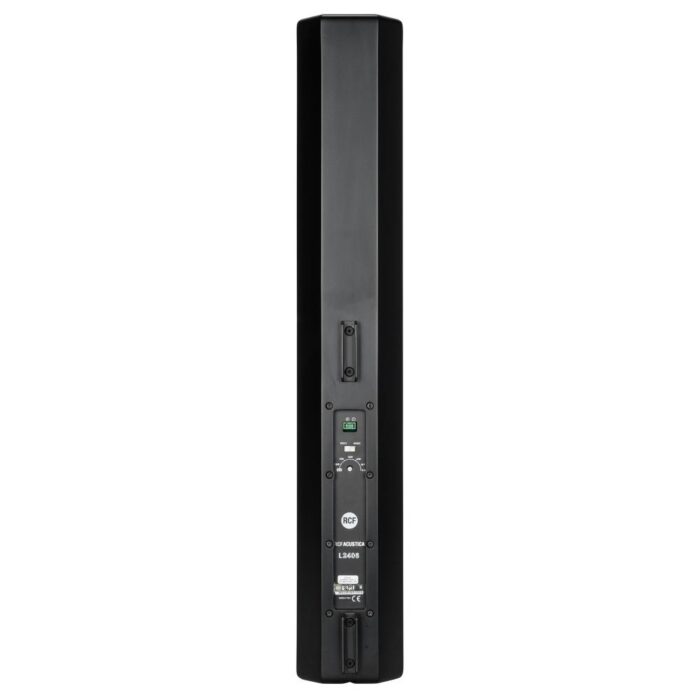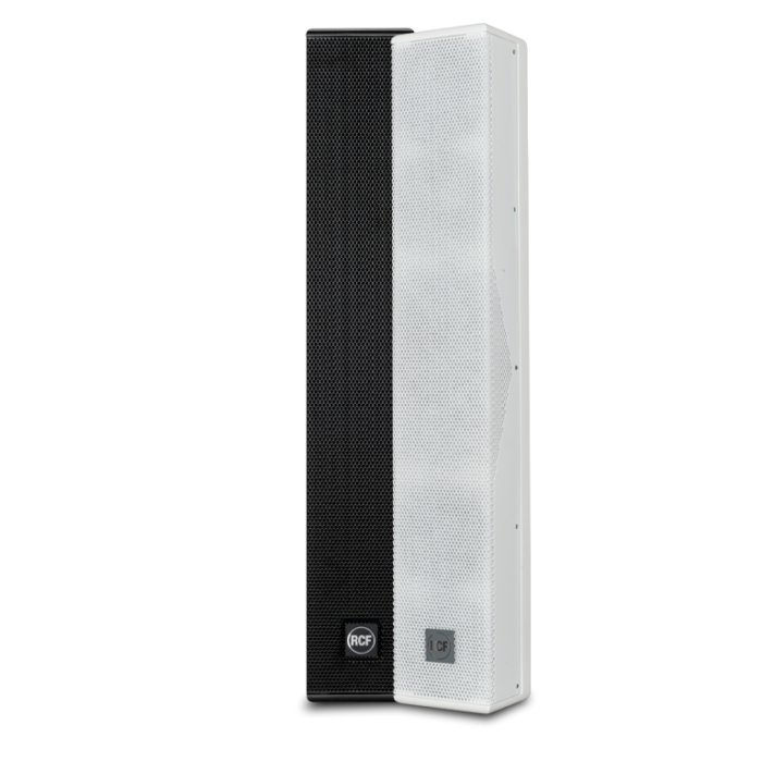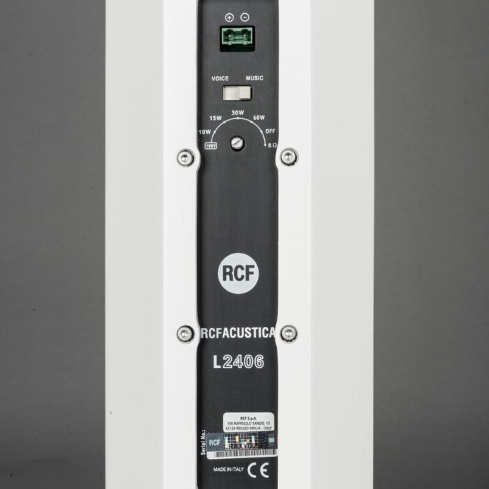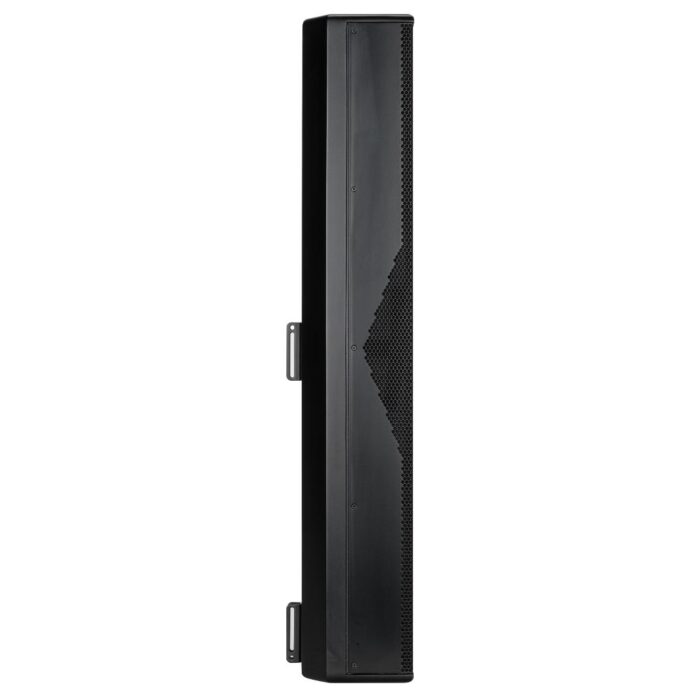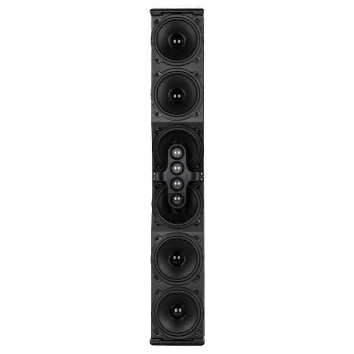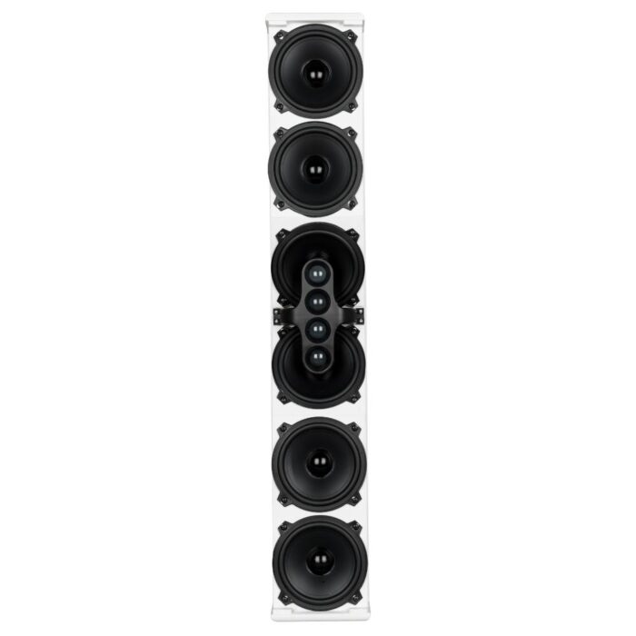 The L2406-T is a full range high intelligibility compact 3 way column speaker array with vertical controlled directivity for medium to large size installations. It is equipped with six 5″ woofers and four 1″ dome tweeters mounted in front of the two central woofers. This particular design permits coherent sound dispersion minimizing lobing in a very compact enclosure. The two central woofers are controlled differently from the other four because of the tweeters in front of them, in order to improve the directivity providing a true cardioid column operation.The wide coverage horizontal angle and the controlled vertical dispersion allow correct sound reproduction serving a wide area and assistance in limiting feedback and reverberated sound. A speech filter can be activated for enhancing the voice frequencies and improving speech intelligibility. The crossover is designed to avoid secondary lobing creation. Mounting accessories are provided and are designed to keep the column as close as possible to the wall and simplify the installation allowing suitable tilting. The L2406-T can be used connected to a low impedance amplifier to handle 200 W RMS power. It also includes a 60 W line transformer for 100 V systems. The crossover is equipped with a circuit to protect the four 1″ dome tweeters.