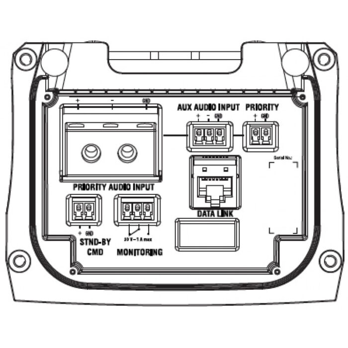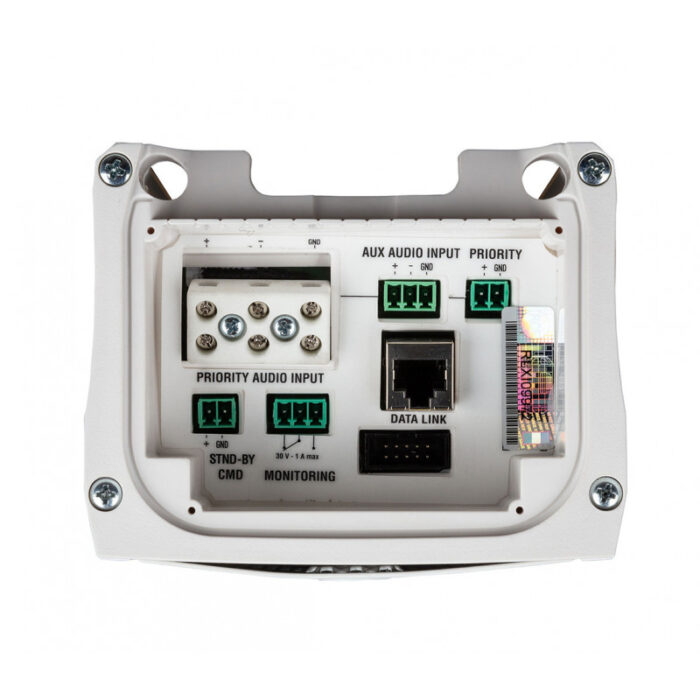 Connection connectors are located on the panel at the bottom of the column and are protected by a special plastic screen. Audio sources can be connected independently via the two balanced Priority and Aux inputs. The Priority connector is equipped with thermally fused ceramic terminals for trouble-free operation of the alarm system. The Data Link port allows control and monitoring using RDNet software, the Monitoring port for remote troubleshooting.