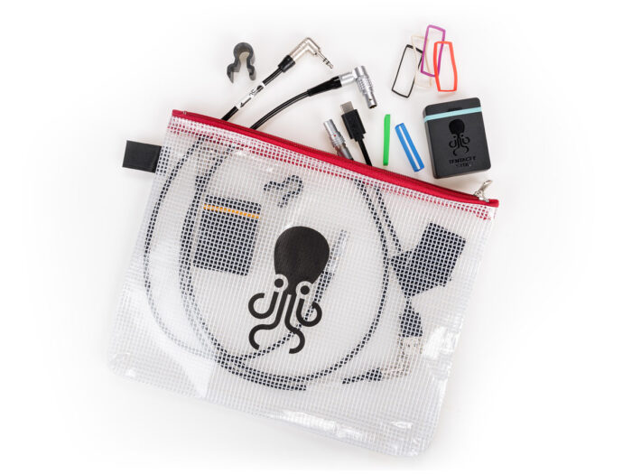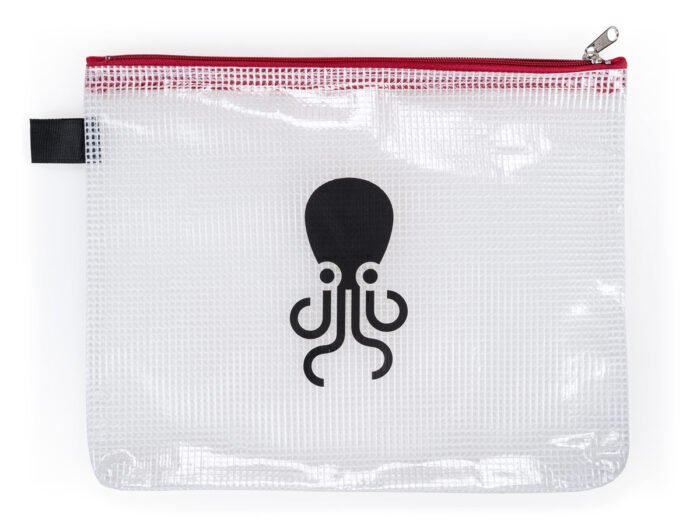 Tentacle Pouch in red with one pocket and metal zip. Use this transparent mesh pouch to organize your cables and Tentacle Sync boxes.