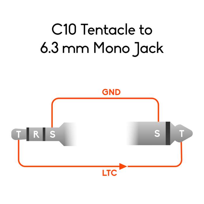 Timecode transmission cable for connecting a Tentacle SYNC E and ORIGINAL timecode generator to a device with a 6.3mm jack input. You need this cable, if you want to use cameras and audio-recorders with audio-jack inputs that don’t offer built-in timecode capabilities. Using this cable, the timecode signal will be recorded as an audio signal on a soundtrack. Suitable e.g. for Blackmagic Camera, Blackmagic Production Camera or audio recorders like Tascam DR680.